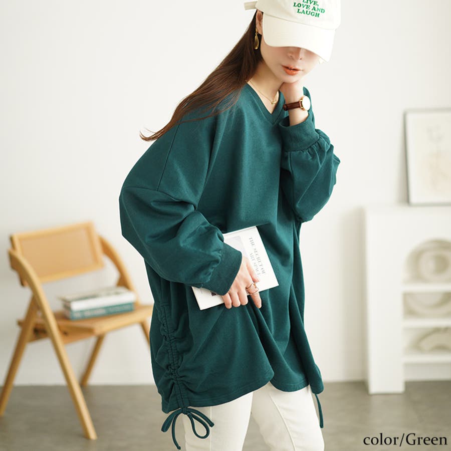 Vネックで大人っぽさを演出し、シンプルなデザインにレディを重ねたチュニック。ふんわりとボリューム感のあるスリーブに、裾のドロストを絞ればラウンドヘムに変化。