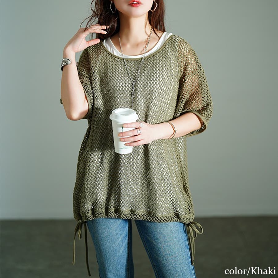 重ね着が楽しくなる今っぽスタイル♪シンプルなタンクトップに目の粗いメッシュ地のニットを重ねるだけで、トレンド的スタイリングに。メッシュの透け感で軽快な印象が重なり、露出し過ぎないから大人の肌見せコーデにぴったり。裾のドロストりぼんが、さり気なく甘さをプラスし、コーデのアクセントに。