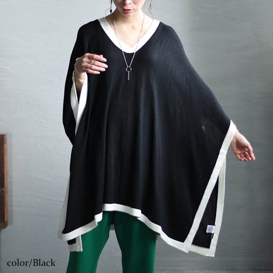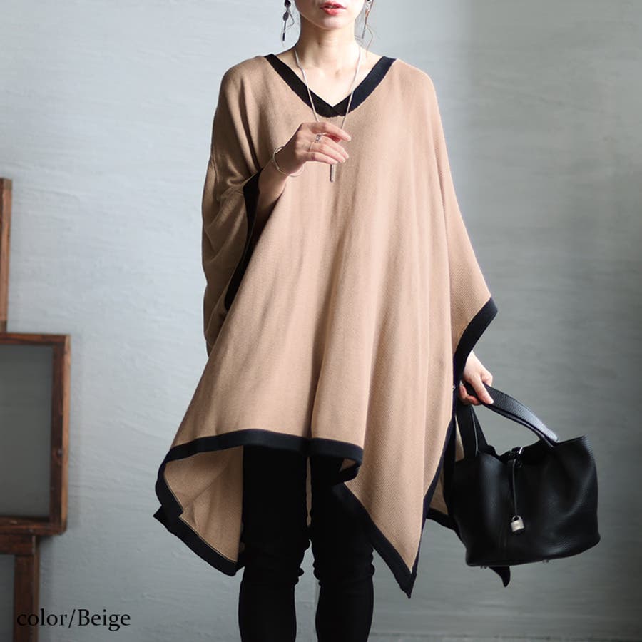 バイカラーのラインがポイントになったニットポンチョの登場です。