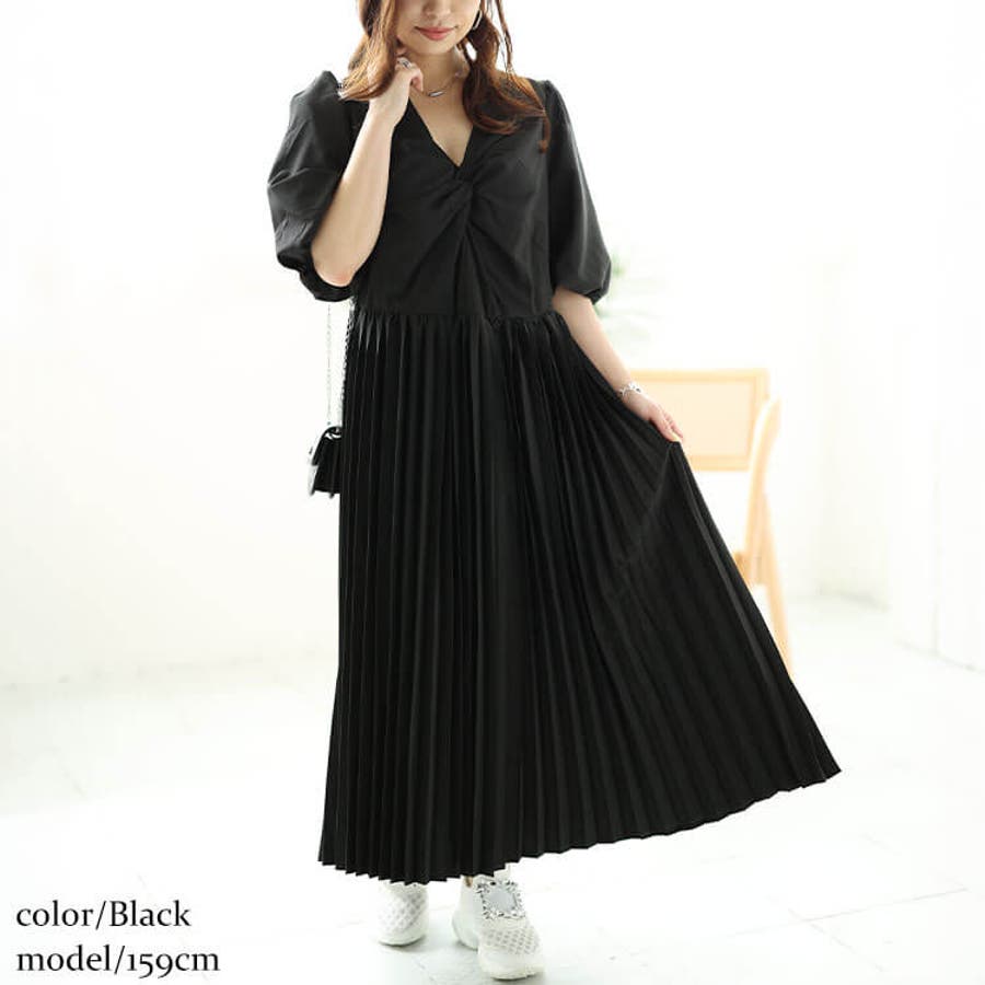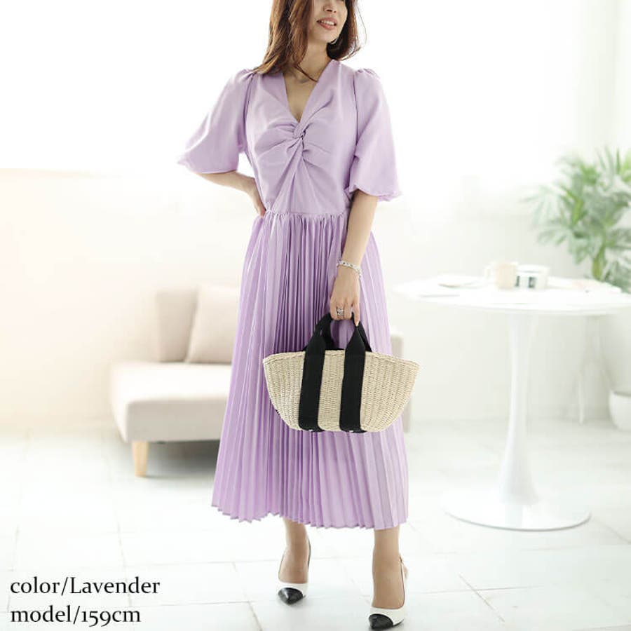 胸元のツイストデザインとボリューム袖がフェミニンなプリーツワンピースの登場です。