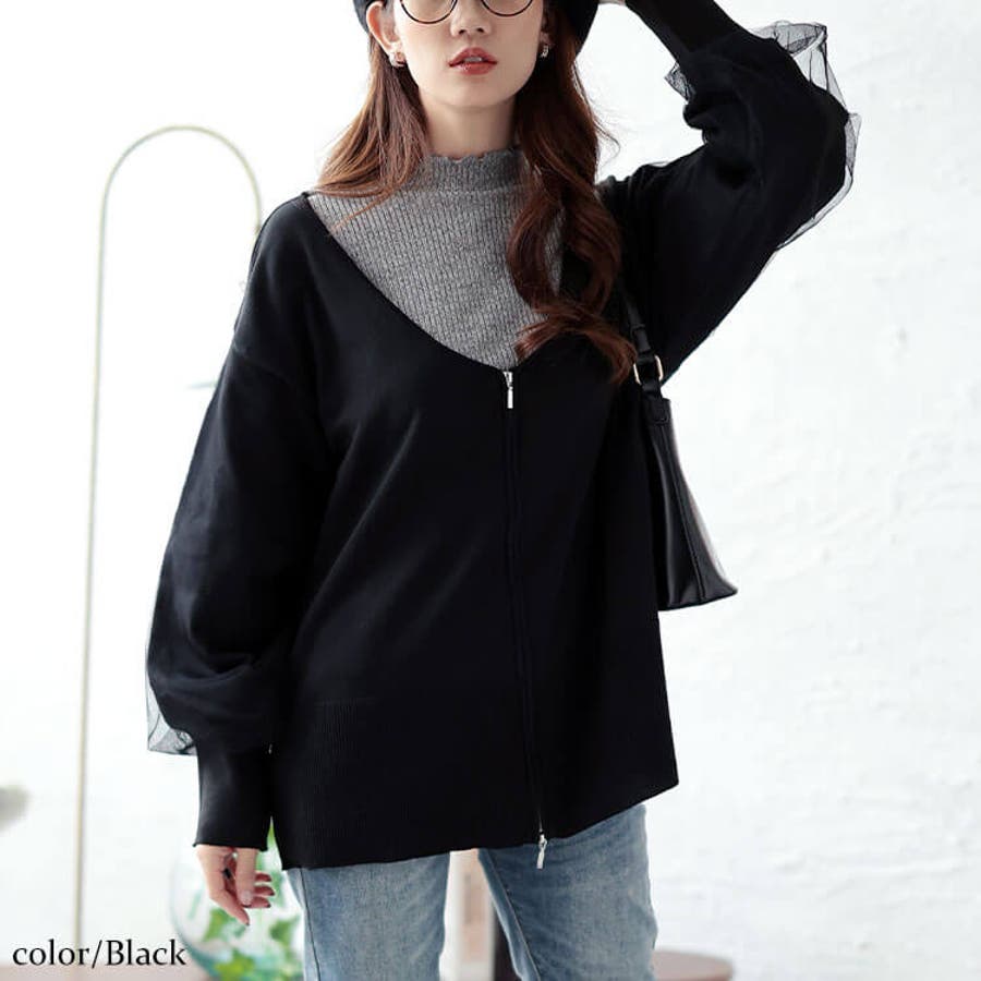 チュール袖が大人可愛い♪ロングシーズン使える袖チュールレイヤードニットZIPカーデの登場です!