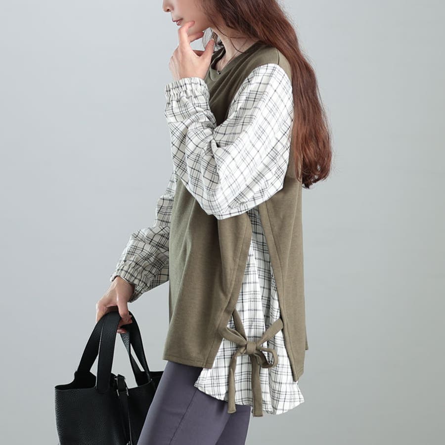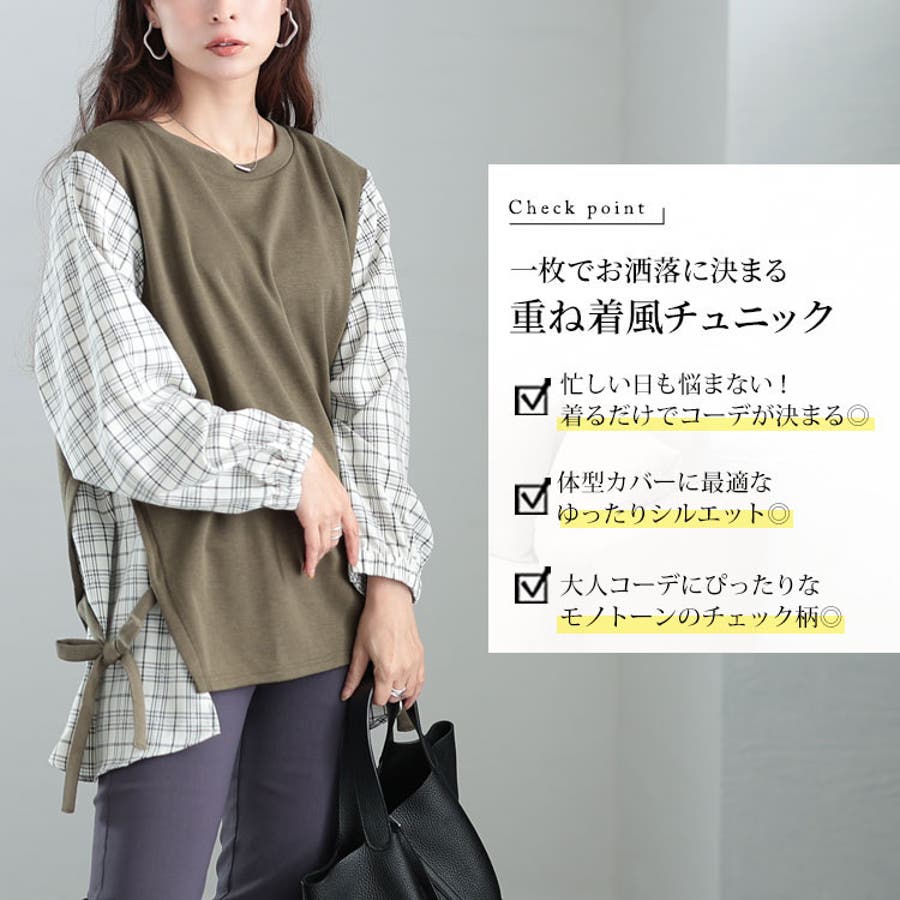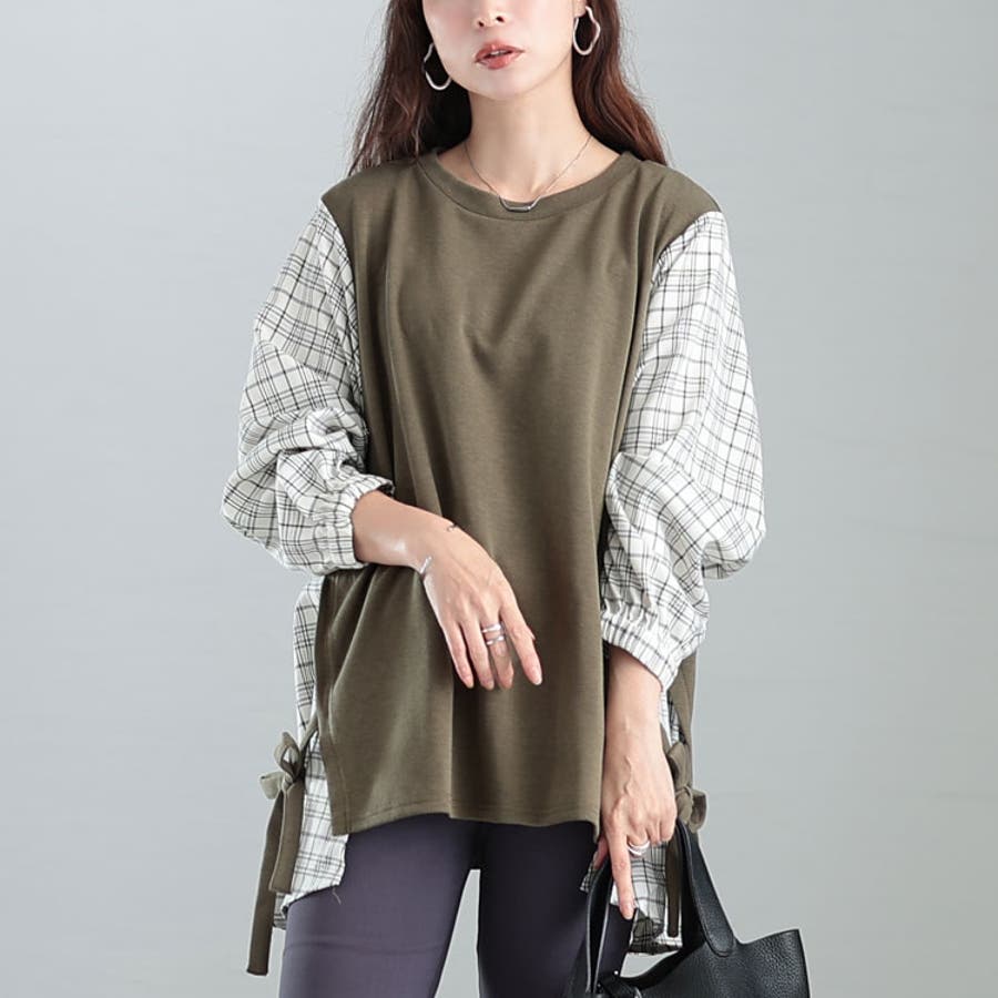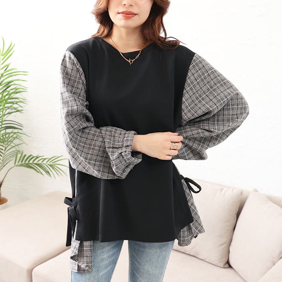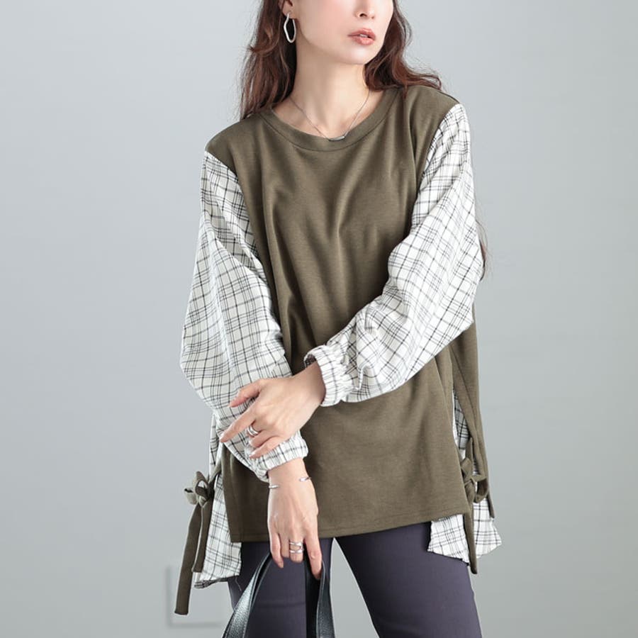 袖と両サイドはチェックのブラウス生地で身頃は伸縮性のあるカットソー素材の大人可愛いデザインです。