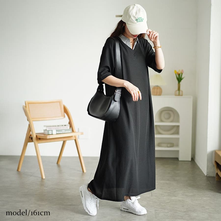 広がりを抑えたシルエットと襟元の切り替えで着痩せ効果も◎