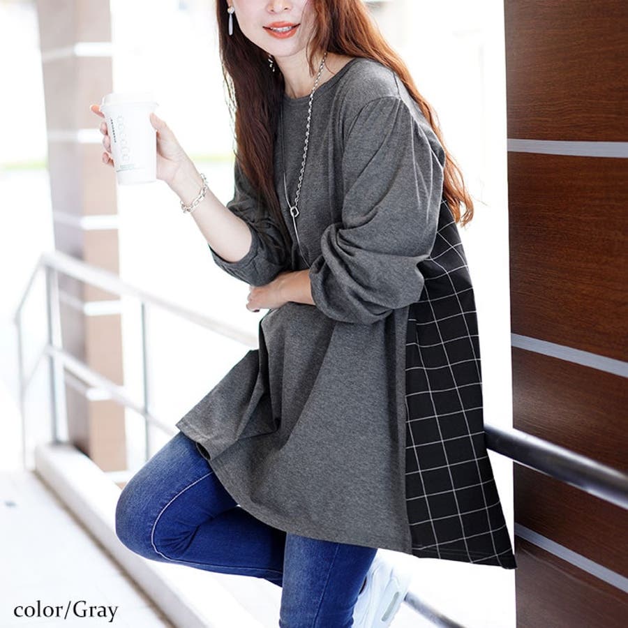 大きいサイズレディース チュニック 後ろチェック切り替えチュニック