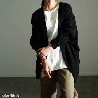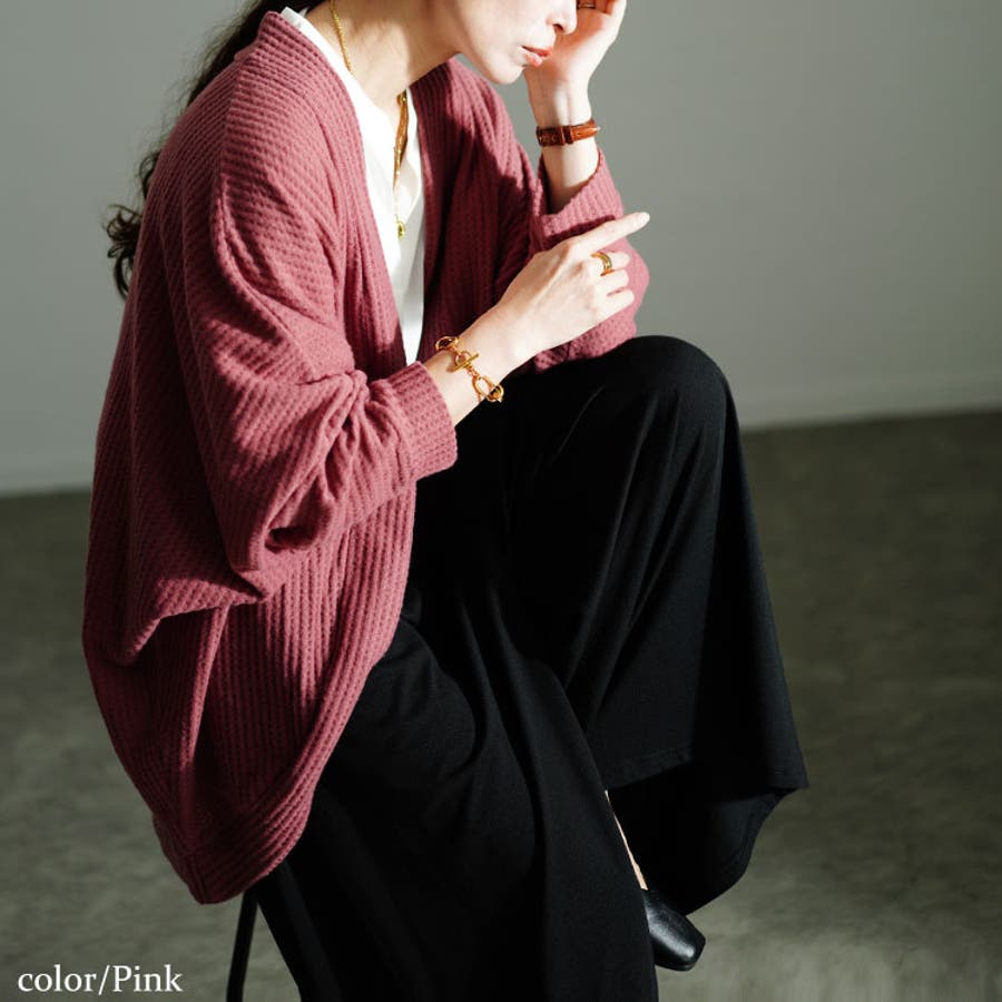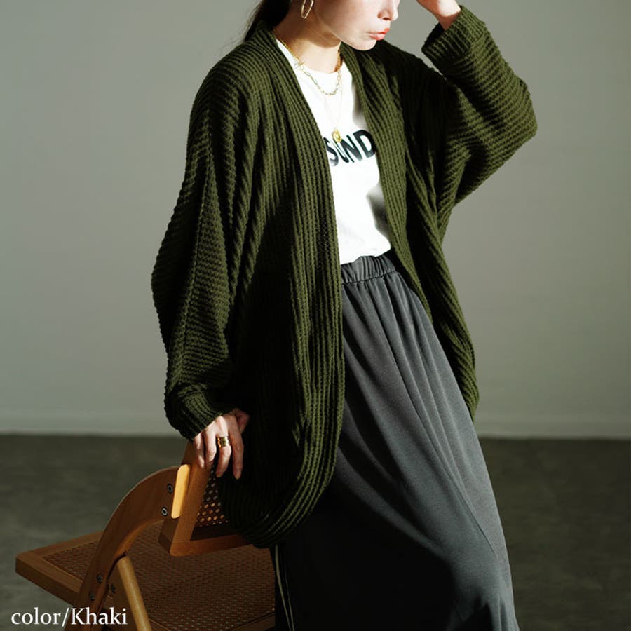 ボタンレスなのでさっと気軽に羽織れて、ゆったりドルマンスリーブのどこから見てもこなれるシルエット。ふんわり気持ちの良い起毛ワッフルニットのぽこぽことした素材の表情がオシャレを惹き立てます。前裾丈はスッキリと後丈は長く仕上げることで、気になるヒップラインもまるっとカバーしてくれます。