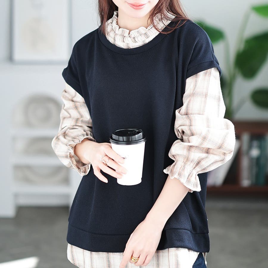 甘さを感じる大人のトラッドスタイルがキマるレイヤード風プルオーバー。チェック柄のブラウスに、ラフなベストを重ねたようなドッキングデザイン。一枚できちんと感をプラスしたトラッドスタイルに仕上がります。首元や袖口のフリル、ボリューム袖がレディな佇まいを演出してくれます。
