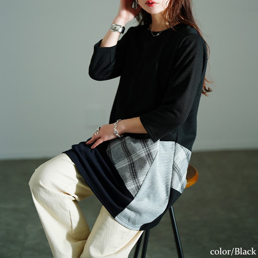 幾何学のように配された切り替えパターンが、シンプルなカットソーにリズムを加えます。派手になりすぎない色合いと、トレンド柄のチェックが大人世代にも着こなしやすく、重厚感のあるブラックを軽やかに演出します。