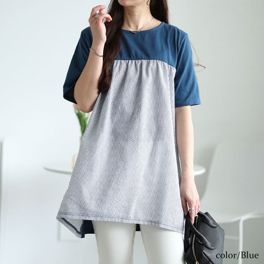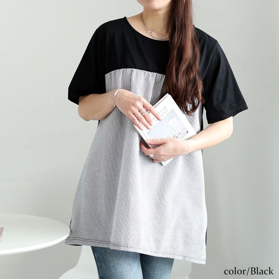 柔らかなカットソー生地と爽やかなストライプ布帛生地の一枚でお洒落な異素材ドッキング。