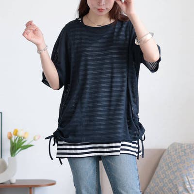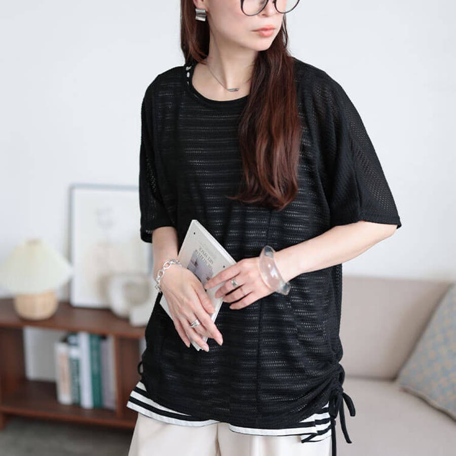 裾サイドのドロスト×ドルマンシルエットが作り出す抑揚感のあるレイヤードスタイルをお楽しみいただけます。