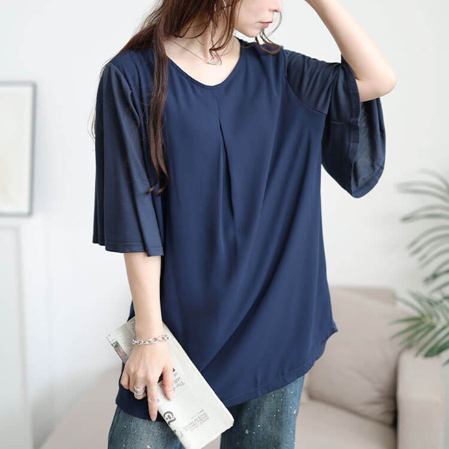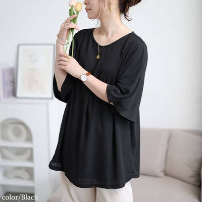 胸元タック&フレアが作り出すふんわりとした女性らしいシルエットでぽっこりお腹はもちろん、大きめのお胸でお悩みの方にもゆったりとご着用いただけます。