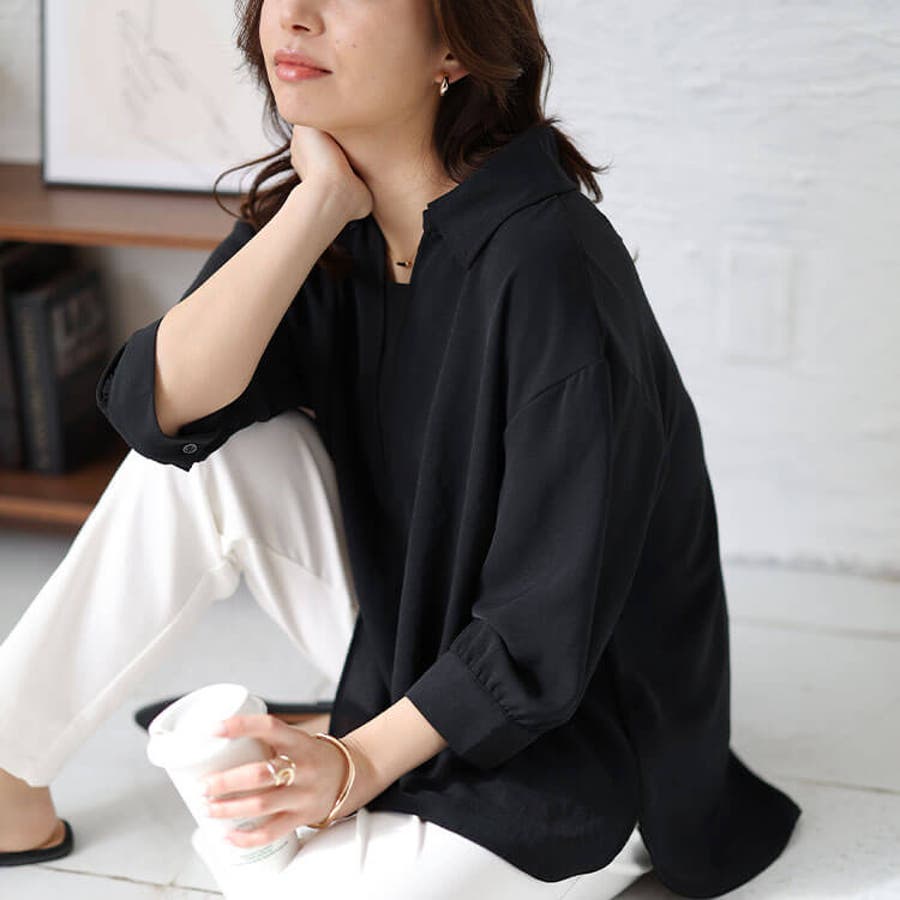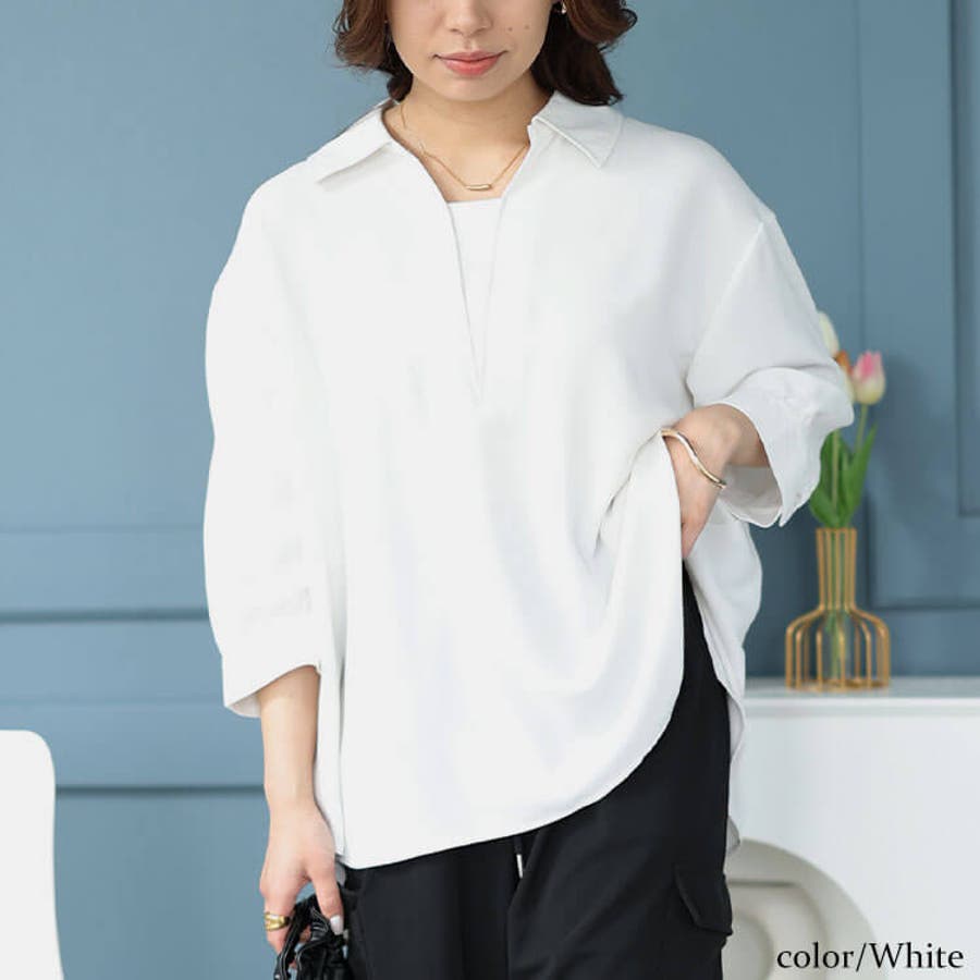 首元やデコルテをキレイに見せるスキッパーでデザインは着るだけで抜け感を演出。
