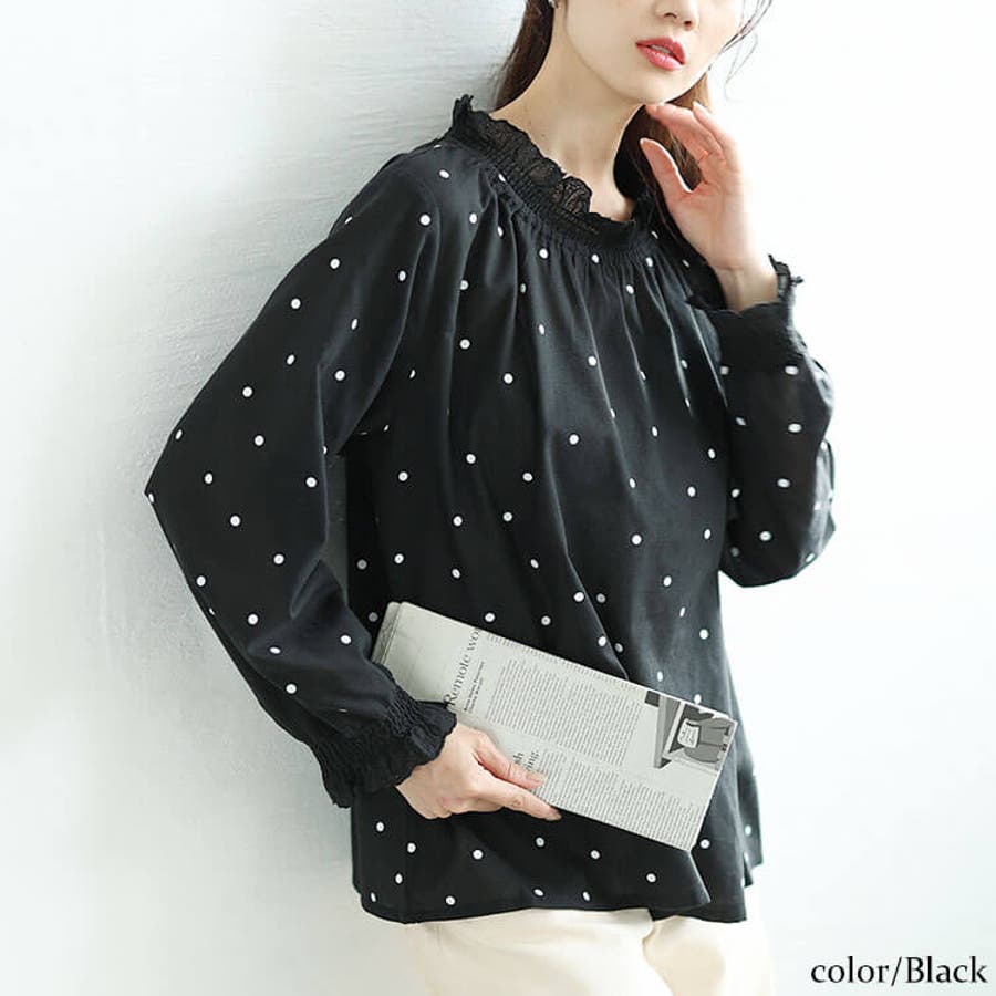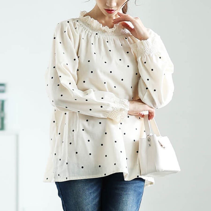 ナチュラルな風合いが大人可愛い、襟袖シャーリングドット柄コットンブラウスの登場です。