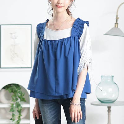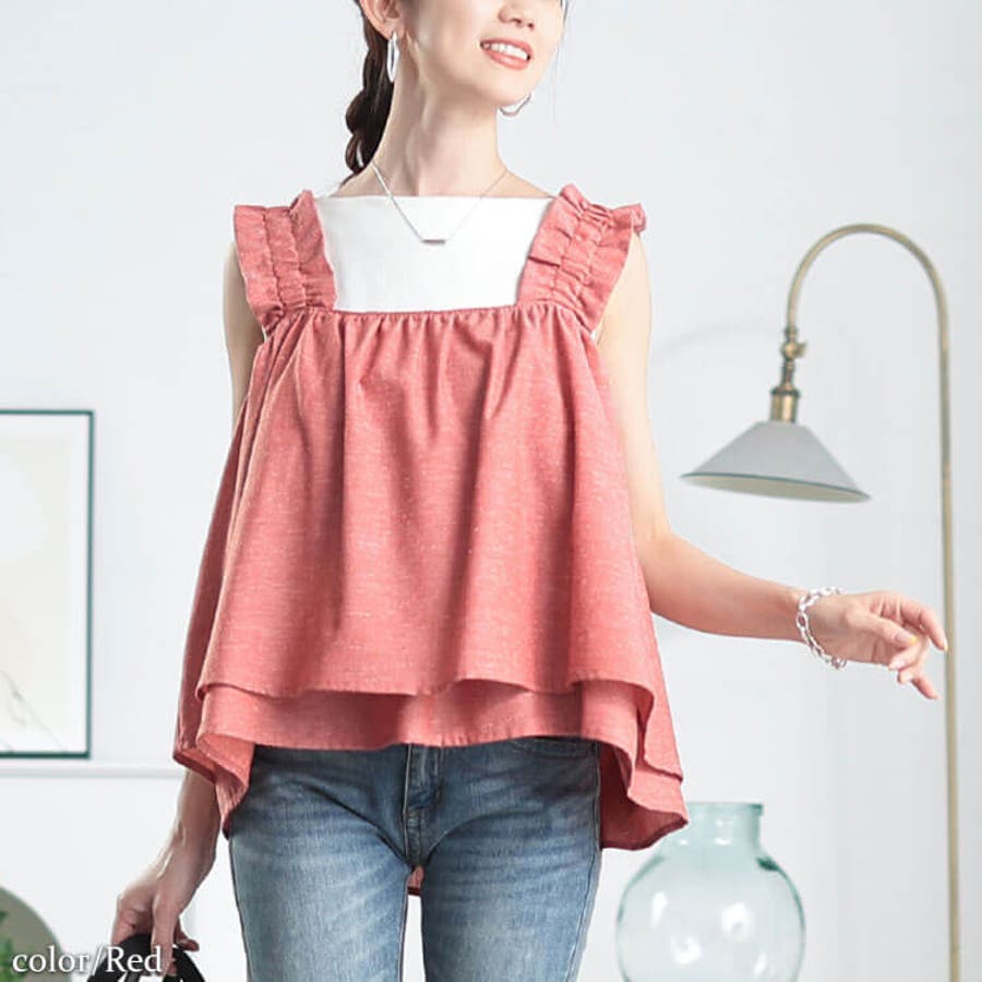 安定感抜群のフリル付きゴム肩紐で重ね着をしても腕まわりは楽ちんに大人可愛く見せてくれます☆