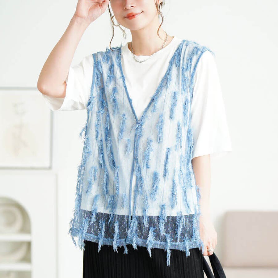 軽やかな透け感のシアーフリンジベストは、羽織るだけで一目置かれること間違いなし!