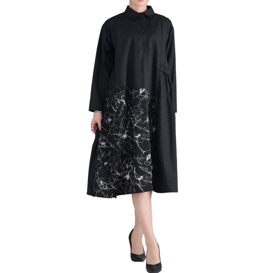左右デザインの異なるアシメ切り替柄ワンピースです。