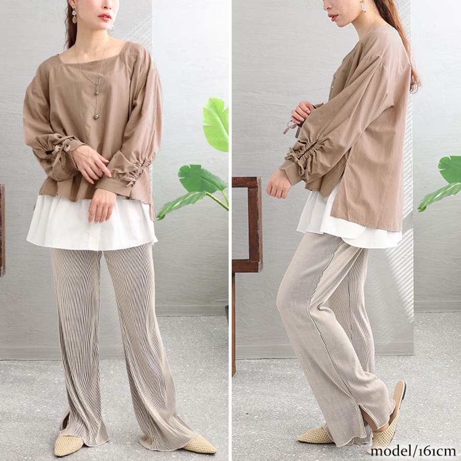 シンプルなシャツに、袖部分はドロストデザインでトレンド感をプラス☆