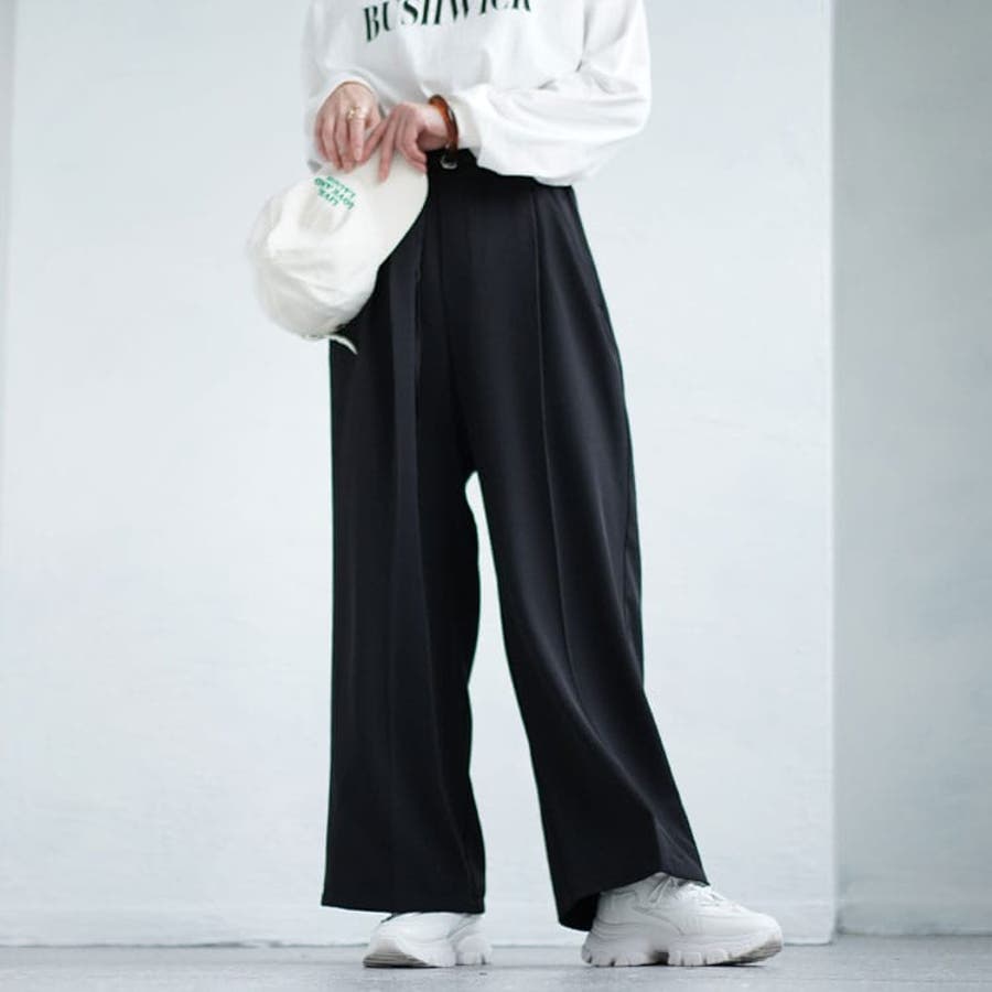 ゆるワイドシルエットで脚のラインを拾わない♪