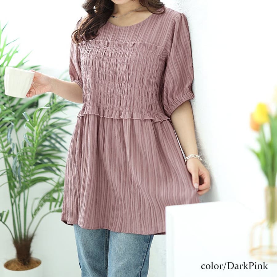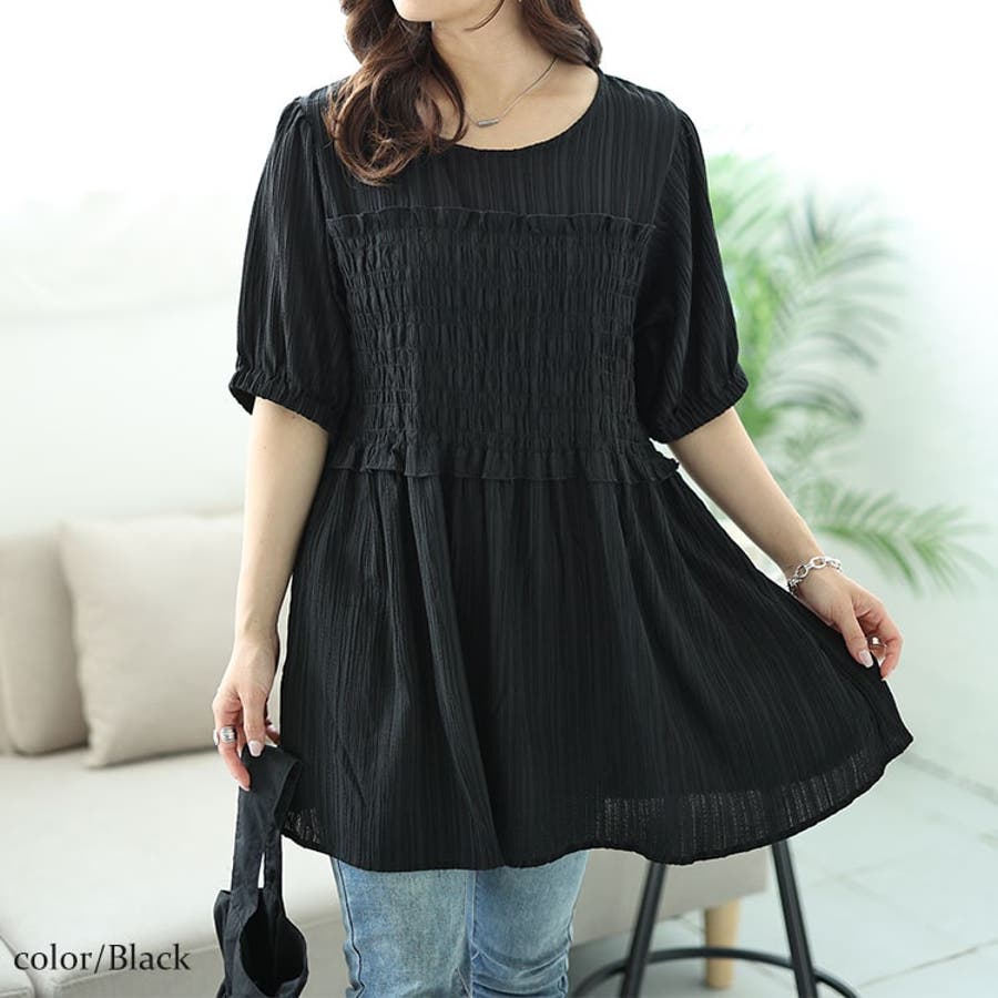 大きいサイズレディース チュニック シャーリングビスチェドッキングペプラムチュニ…