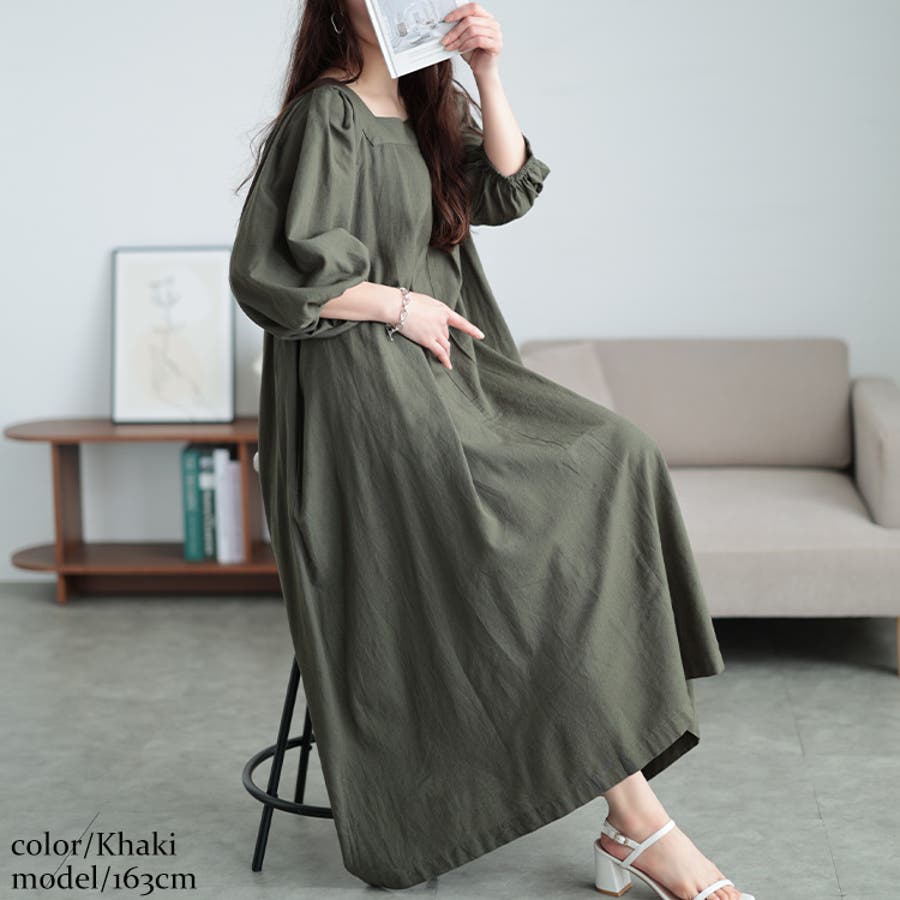 コットンリネンスクエアネックワンピース