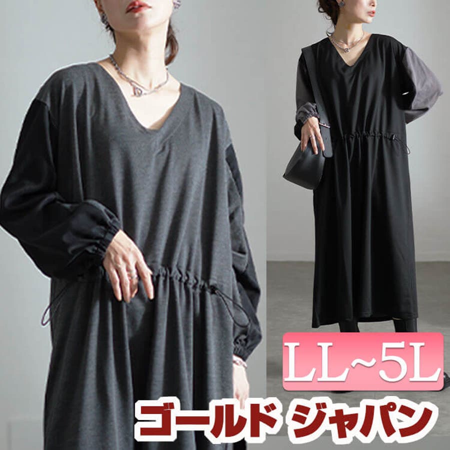 大きいサイズレディース ワンピース バイカラー袖ウエストドロストワンピース
