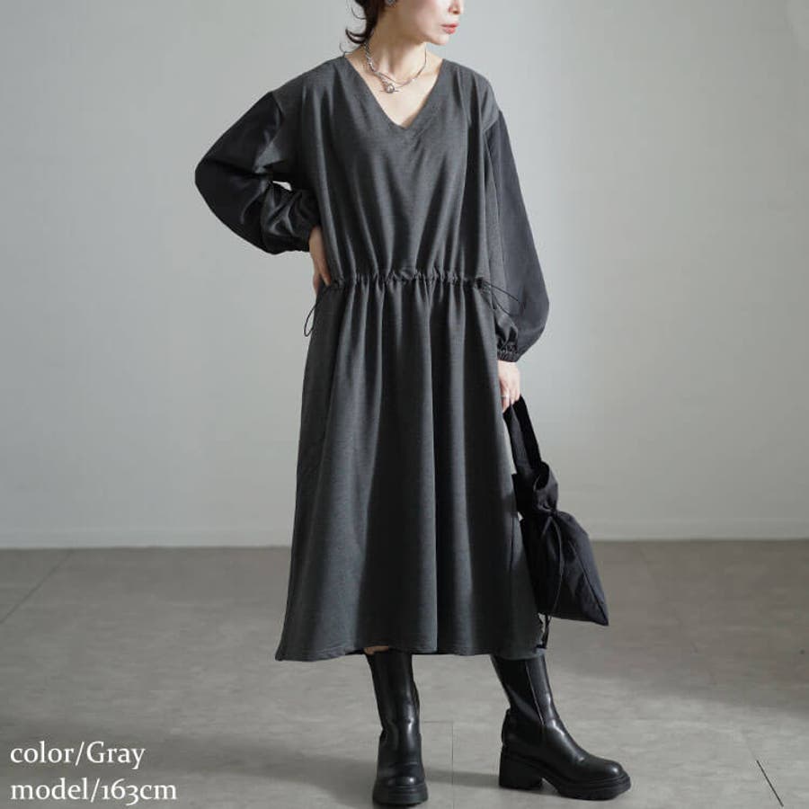 バイカラー袖ウエストドロストワンピース