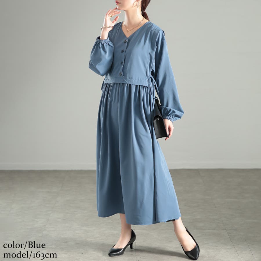 同色のベストを重ねているような、レイヤード風デザインだから一枚でコーデが完成。ウエストサイドには、リボンが結べる仕様で女性らしいアクセントに。切り替え部分のたっぷりギャザーでふんわりと体型をカバーしてくれる頼れるワンピース。