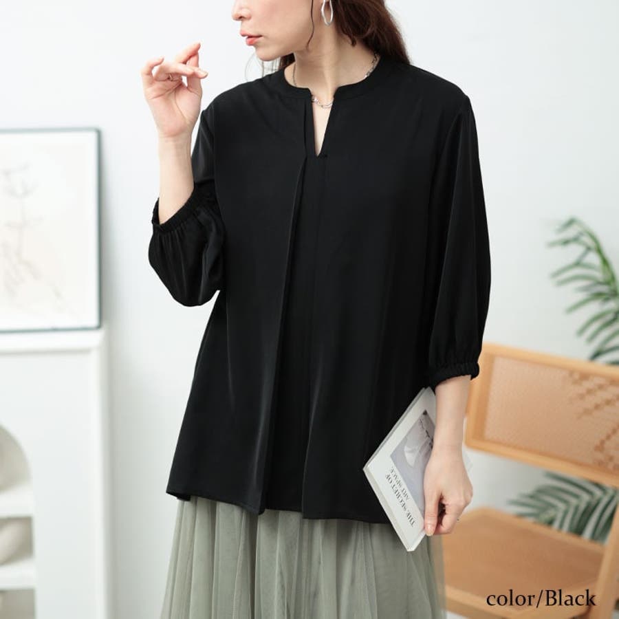 ノーカラーキーネックで首元に抜け感を演出、スッキリ好印象なブラウスです!