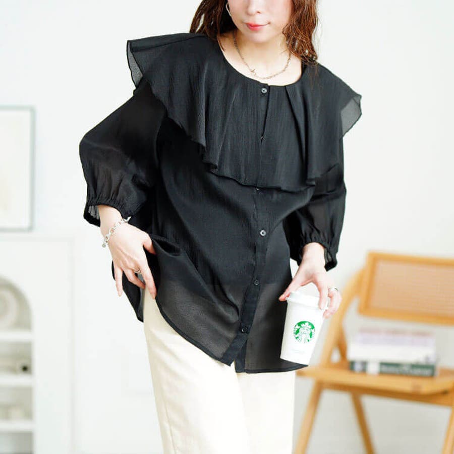 前後2wayで着用できるデザインでブラウス&羽織りとして大活躍し、着まわしがグッと広がります♪
