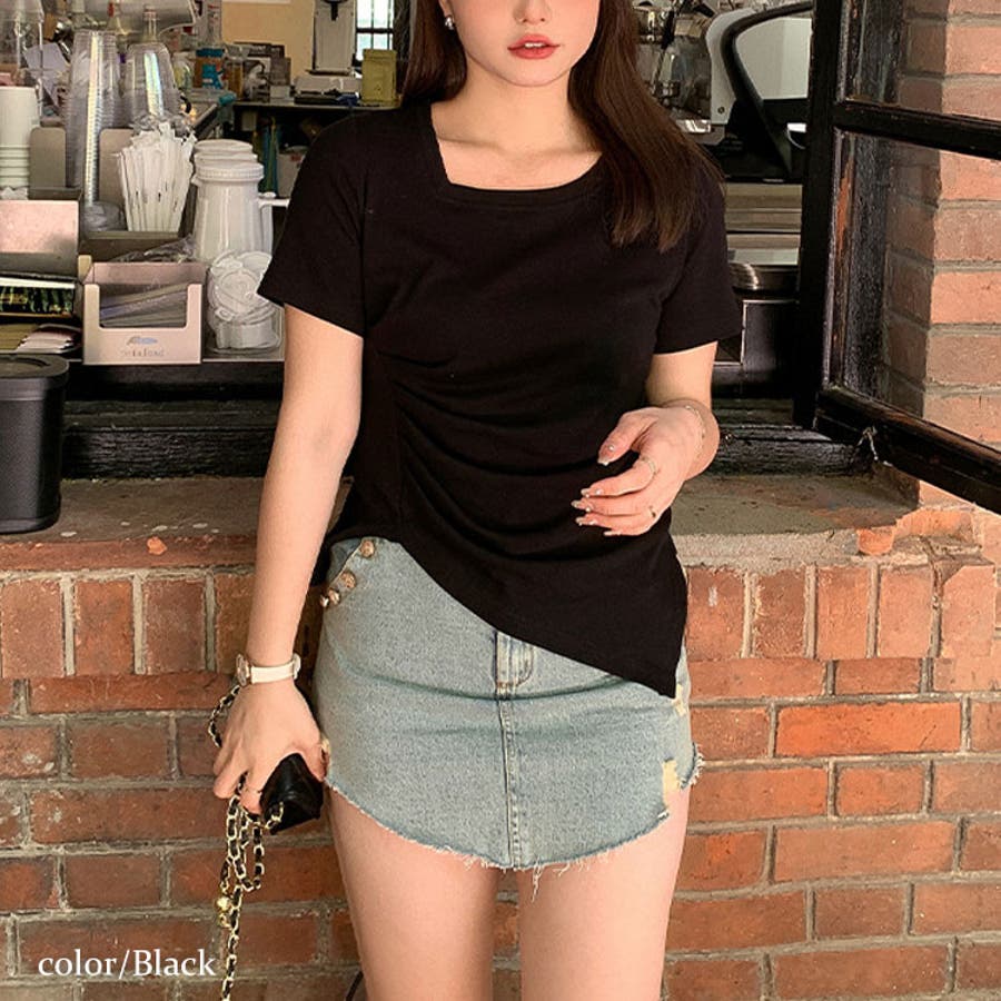 柔らかく伸縮性のある生地とギャザーデザインが体型を選ばず、幅広い年齢層の方におすすめのデザインカットソーです。