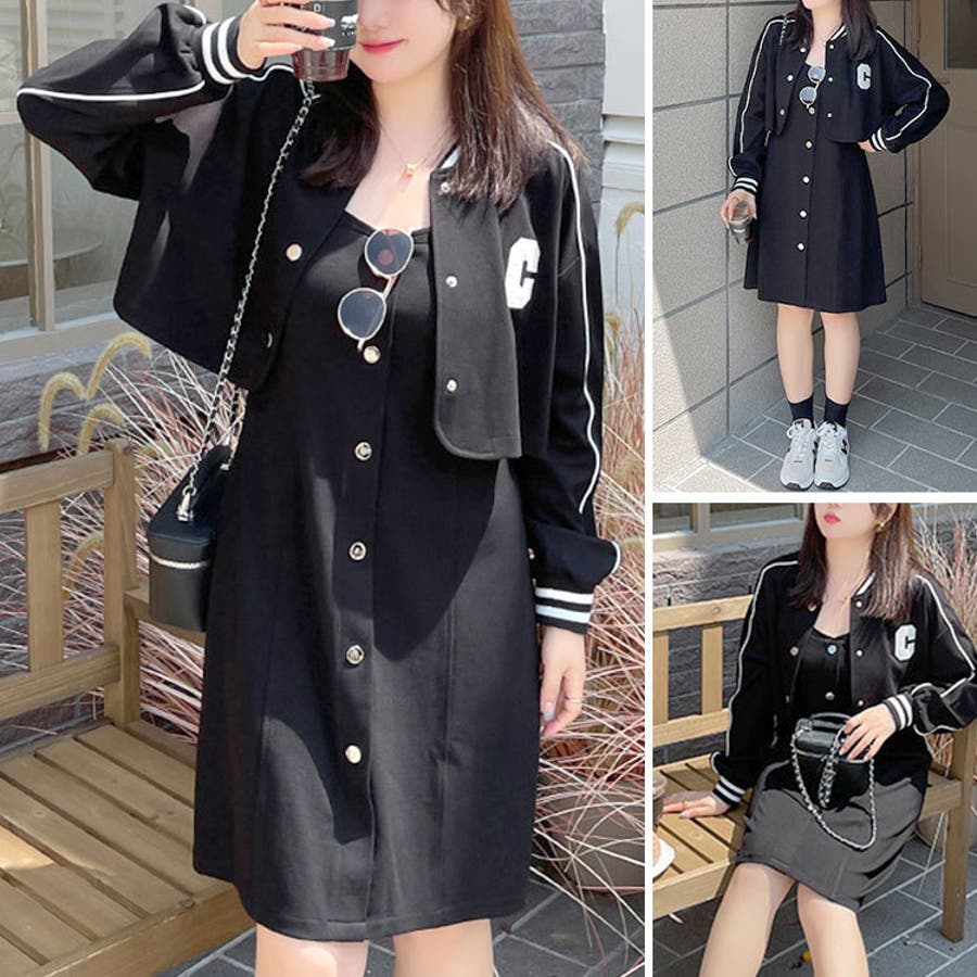 ストリート感のあるアウターと可愛いキャミワンピの2点セットです。