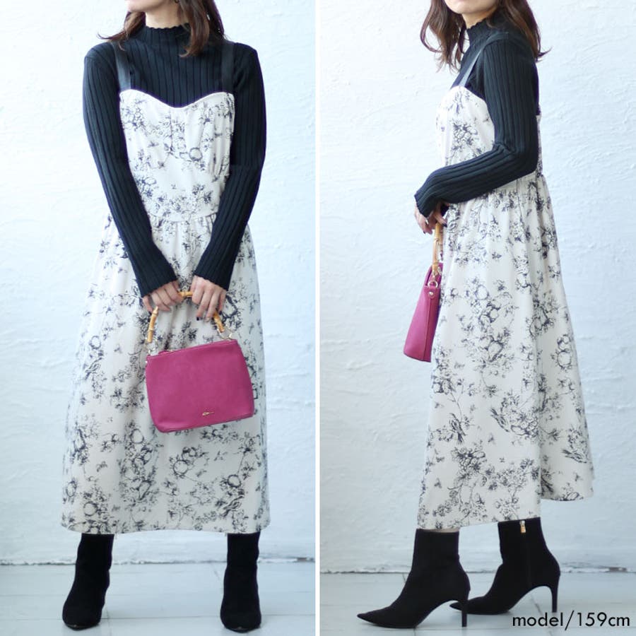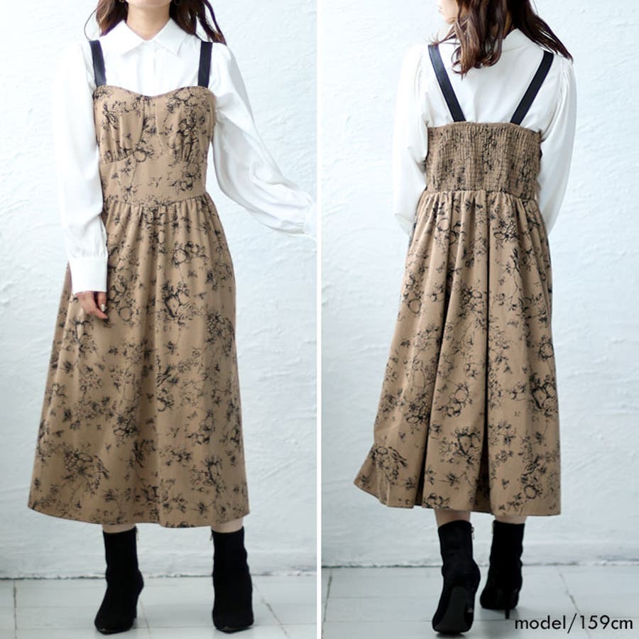 シックな花柄が女性らしさを引き立てるジャンパースカートです。