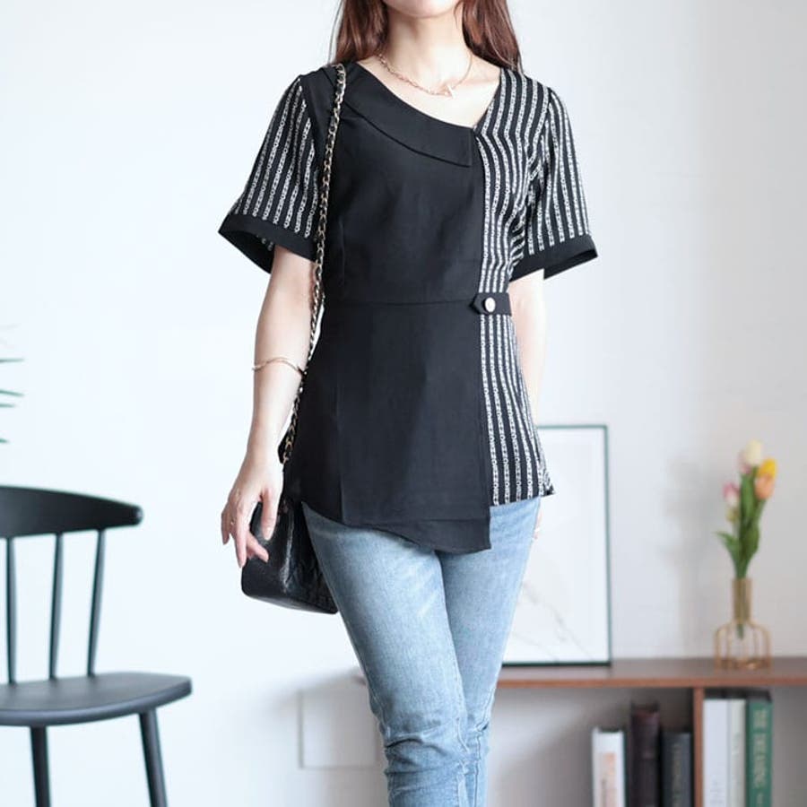 柄切替えアシンメトリートップス