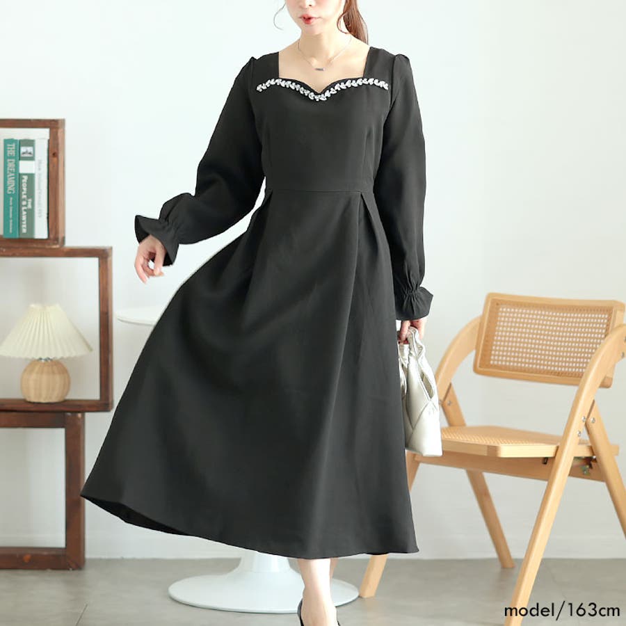 大きいサイズレディース ワンピース ビジュー付きハートネックロングワンピース