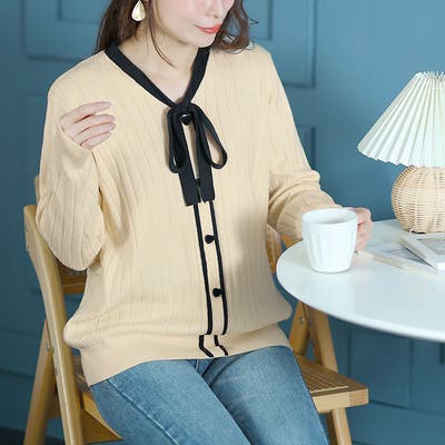 バイカラーのリボンタイがアクセントになったリブニットです。