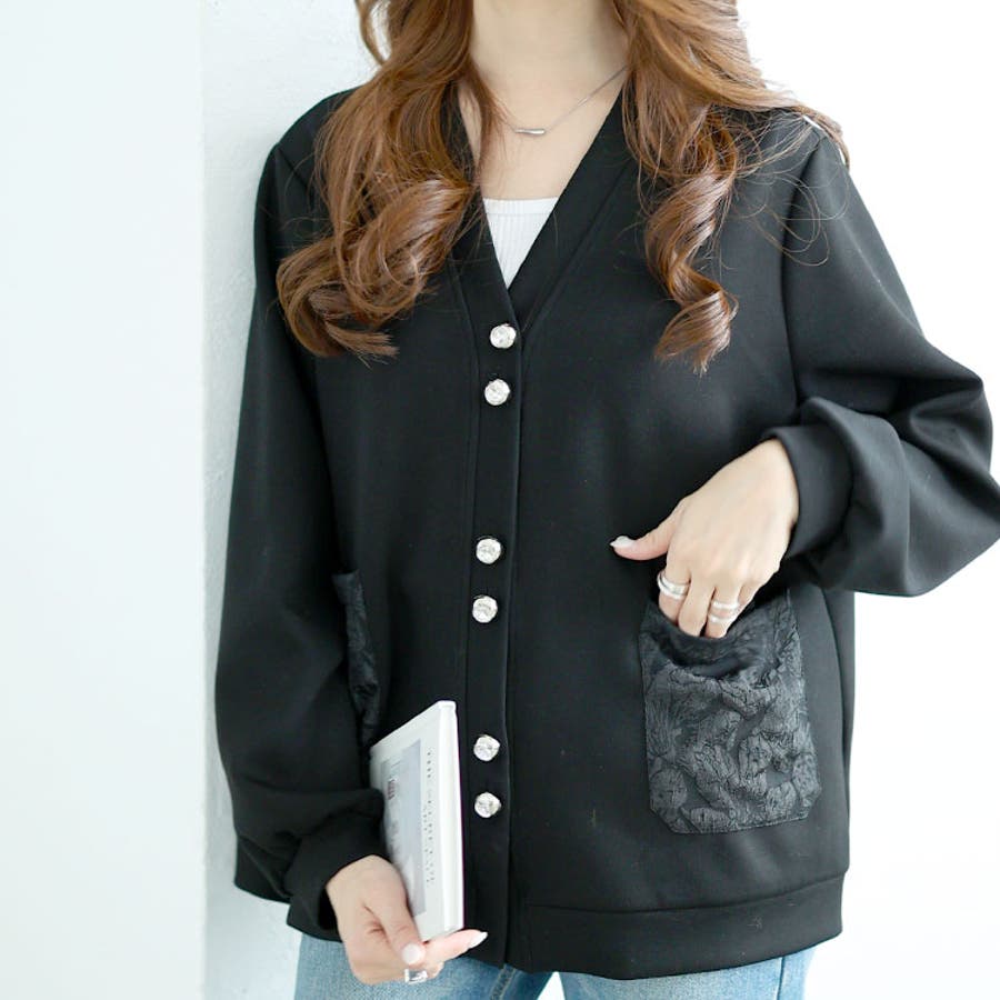 ボタンはきらきら光るビジューになっており、シンプルなカーデを華やかに☆