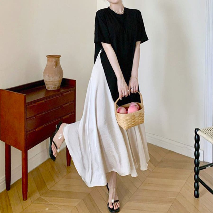 スカートはシルクのようなさらっとした軽い生地に切り替わったワンピース。