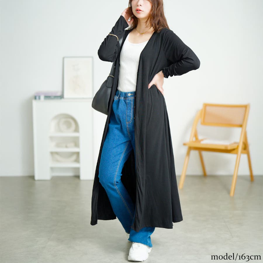体型カバーの魅力がたっぷり。ロング丈の長袖カーディガンです。
