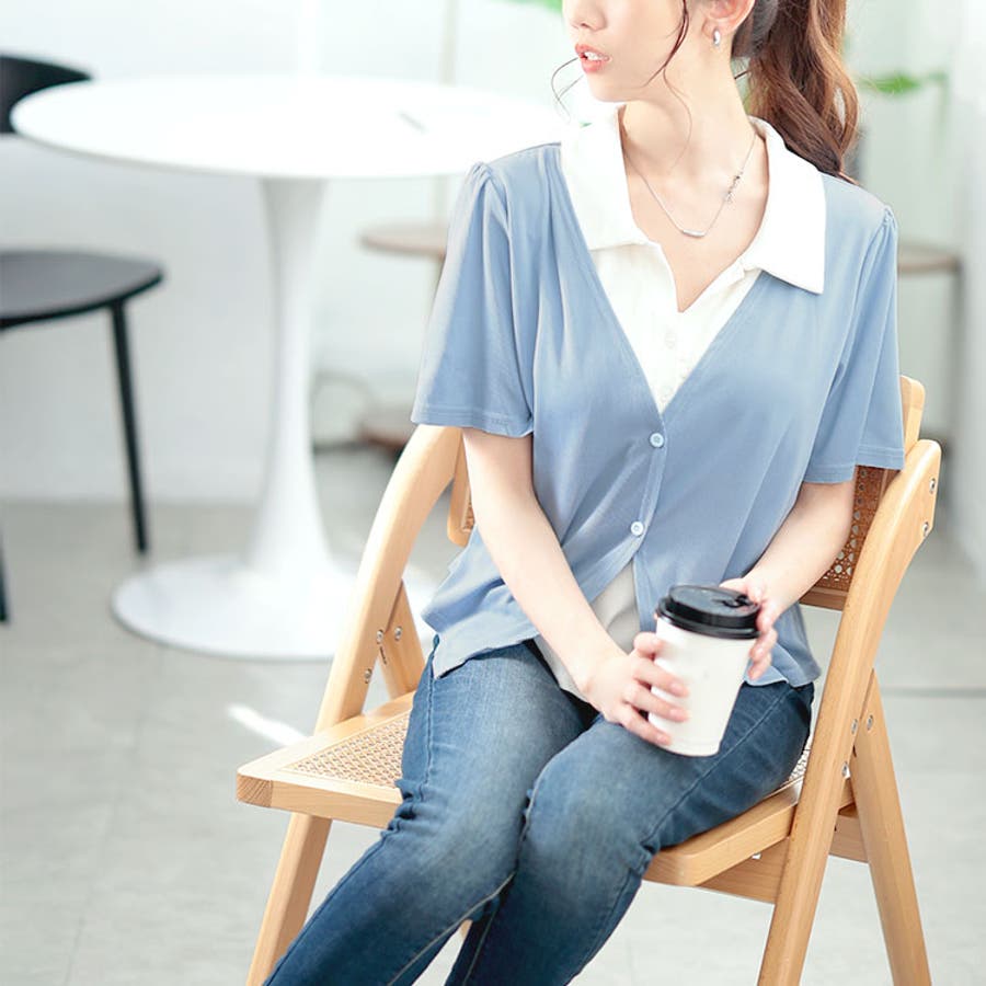 シャツ+カーディガンはボタン開きになっているので、コーデの印象チェンジも◎