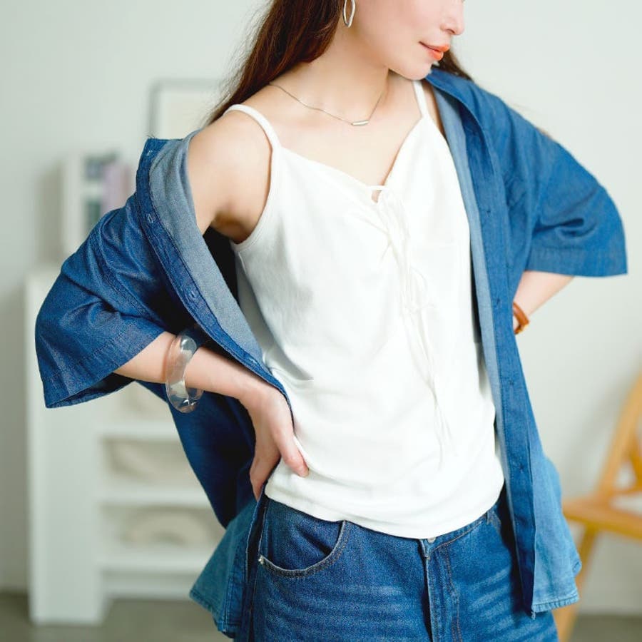 簡単にレイヤードコーデを楽しめるリボン紐付きのキャミソールです。