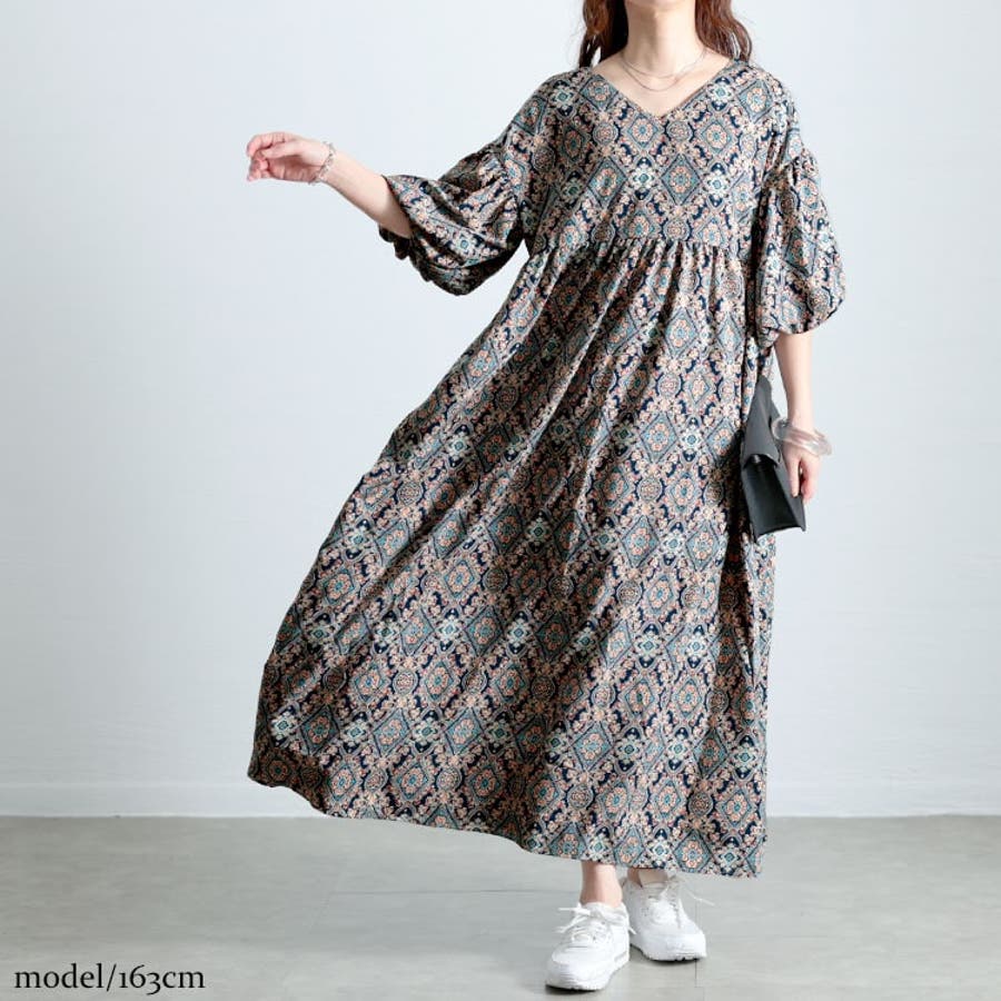 バルーン袖オリエンタル柄ロングワンピース