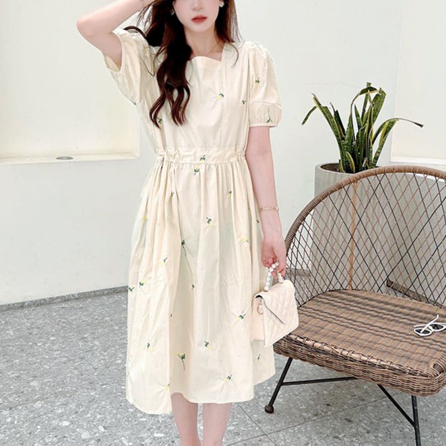 プチフラワー刺繍ミディ丈ワンピース