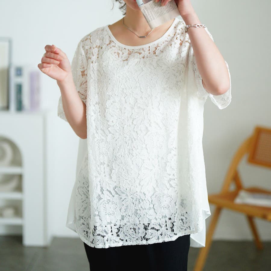 フロントと袖は、透け感のある繊細な花柄レース。