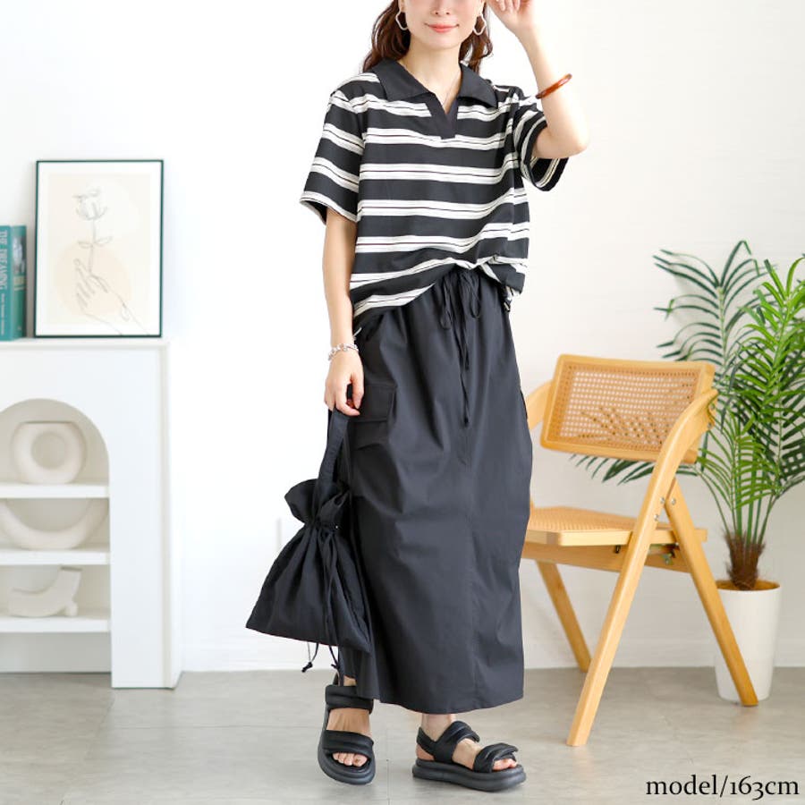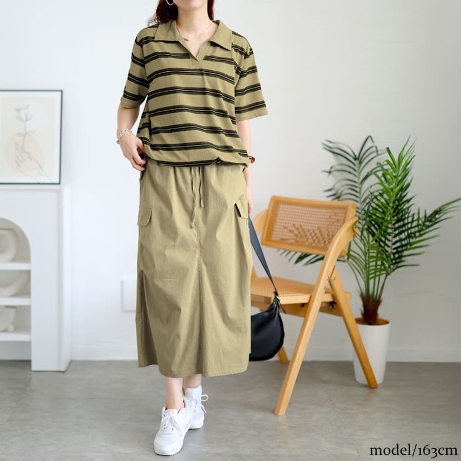 キーネックポロTとミリタリー風のロングスカートのセットアイテムです。