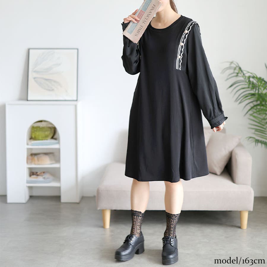 シンプルなワンピースに華やかなアクセントをプラスしたフリル袖ワンピースです。