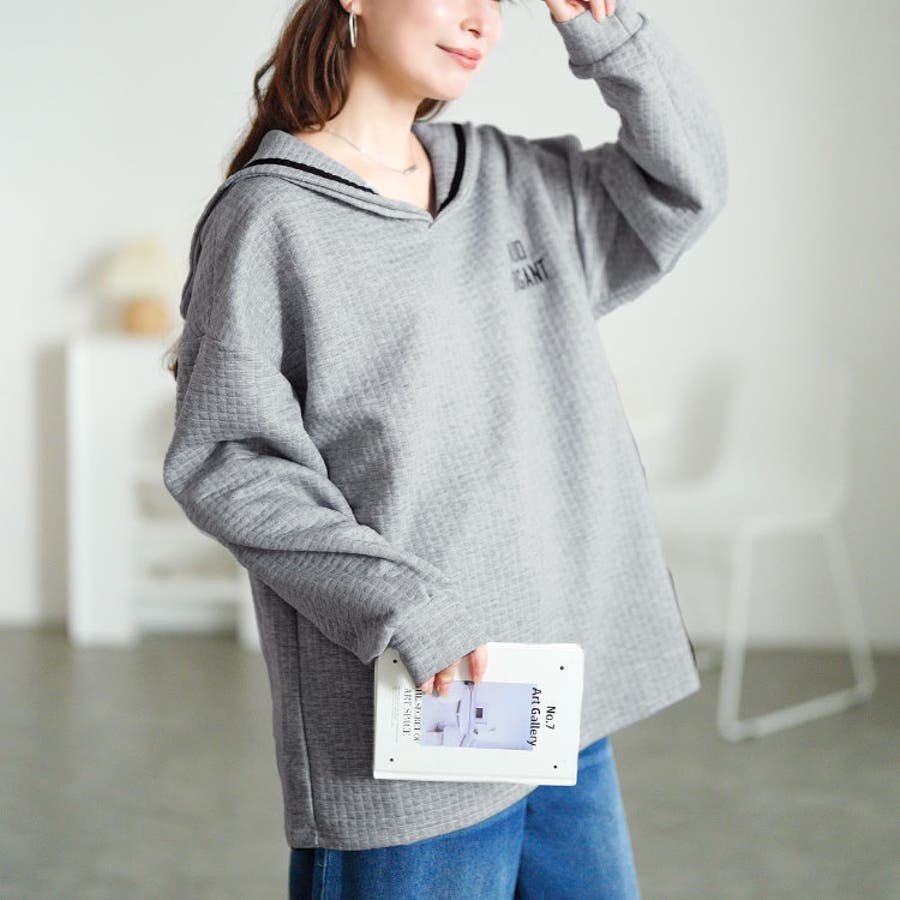Vネック×セーラーカラーの組み合わせが大人可愛い印象をプラス。
