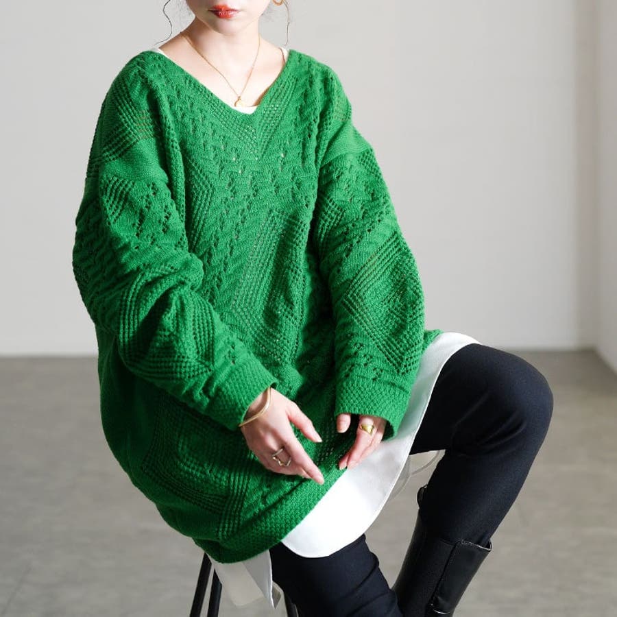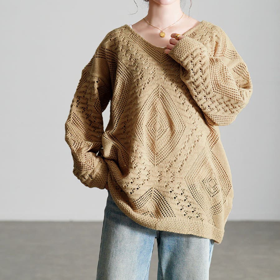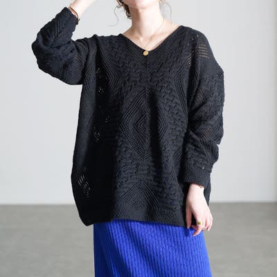 Vネックで顔周りをすっきり見せ、ダイヤ柄の透かし編みでおしゃれ度をアップ。