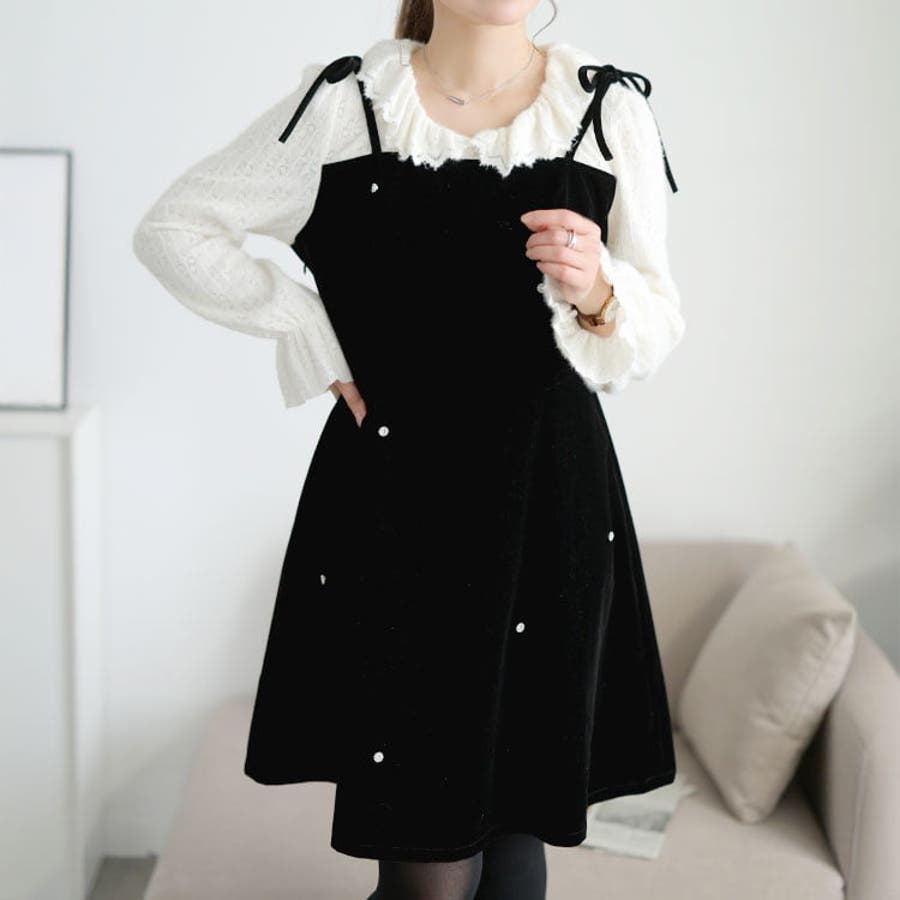 ブラックベロアにランダムにあしらわれたビジューが甘さの中に大人っぽさをプラス。