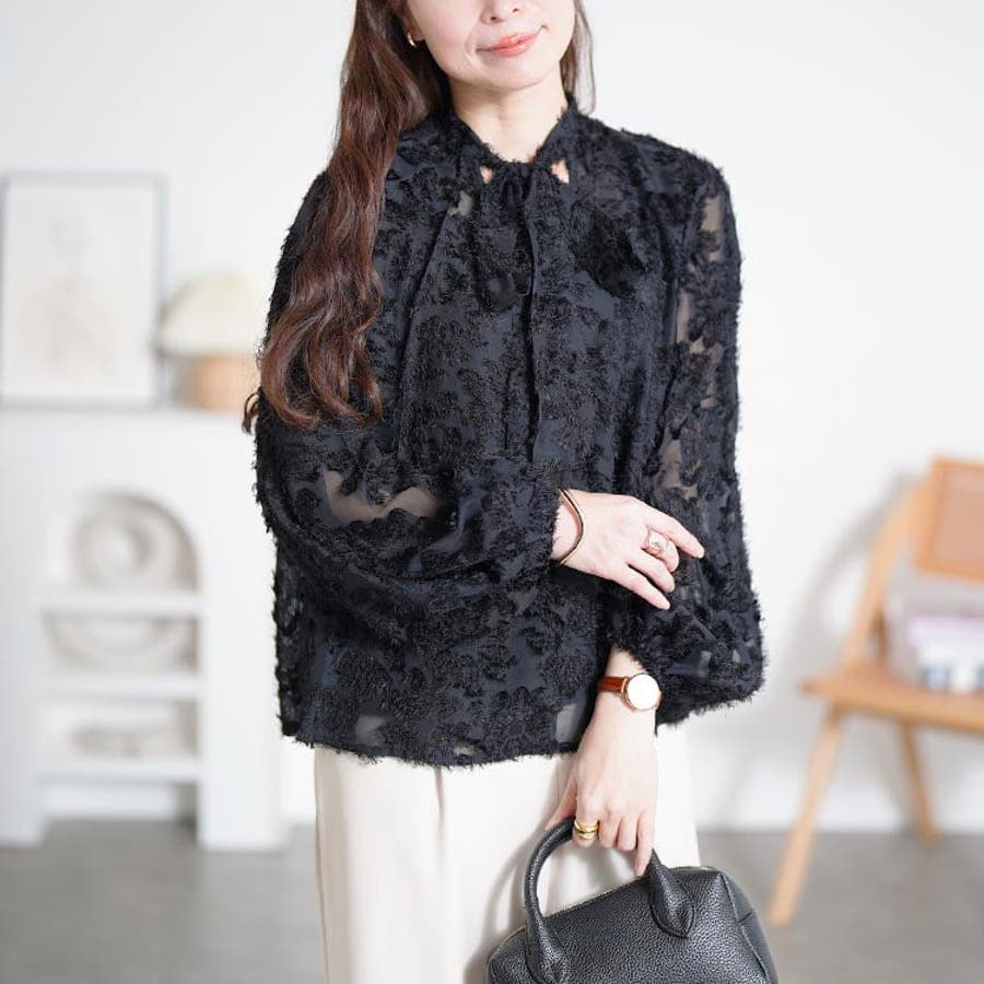 上品さと今っぽさを兼ね備えたボウタイ付きシアーブラウス。