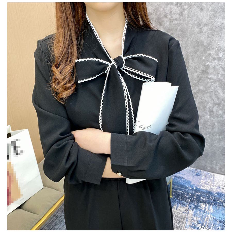 襟とボウタイがくっついた長袖ブラウスです。