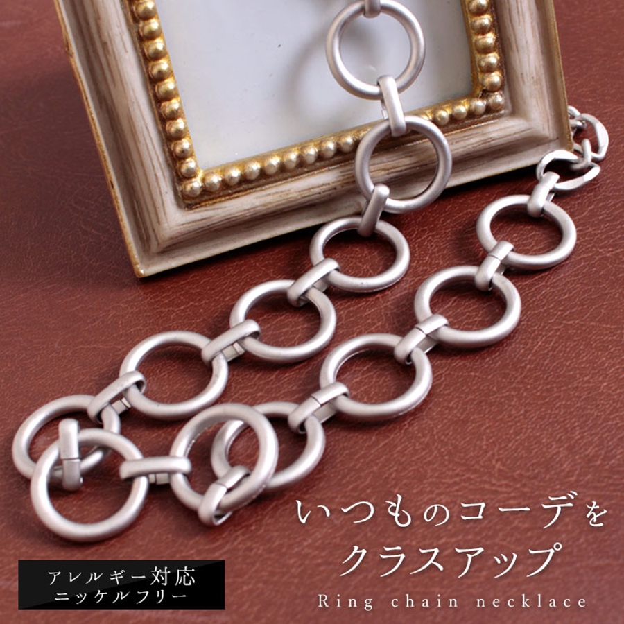 シンプルなチェーンがすっきりとした印象ながらも、大きなリングモチーフがユニークで魅力的。
